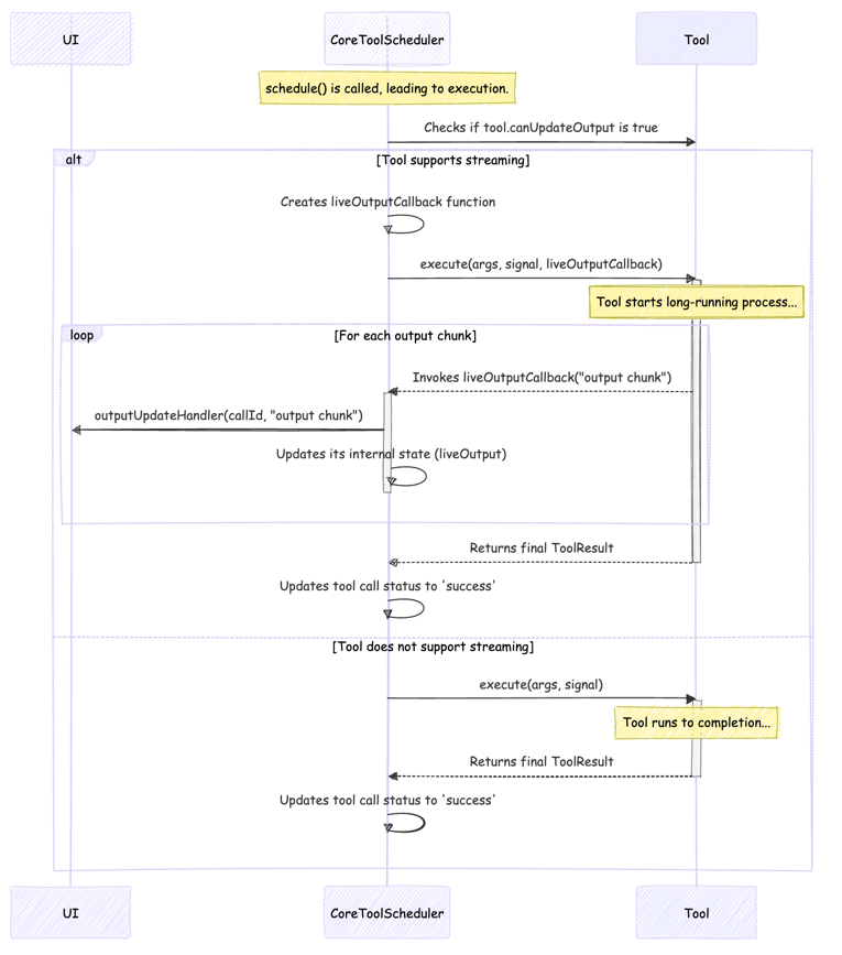 For long running tools, a classic callback pattern is used. The scheduler provides a function to the tool, and the tool calls that function with its output whenever it has something new to report, creating a direct stream from the executing tool back to the UI.