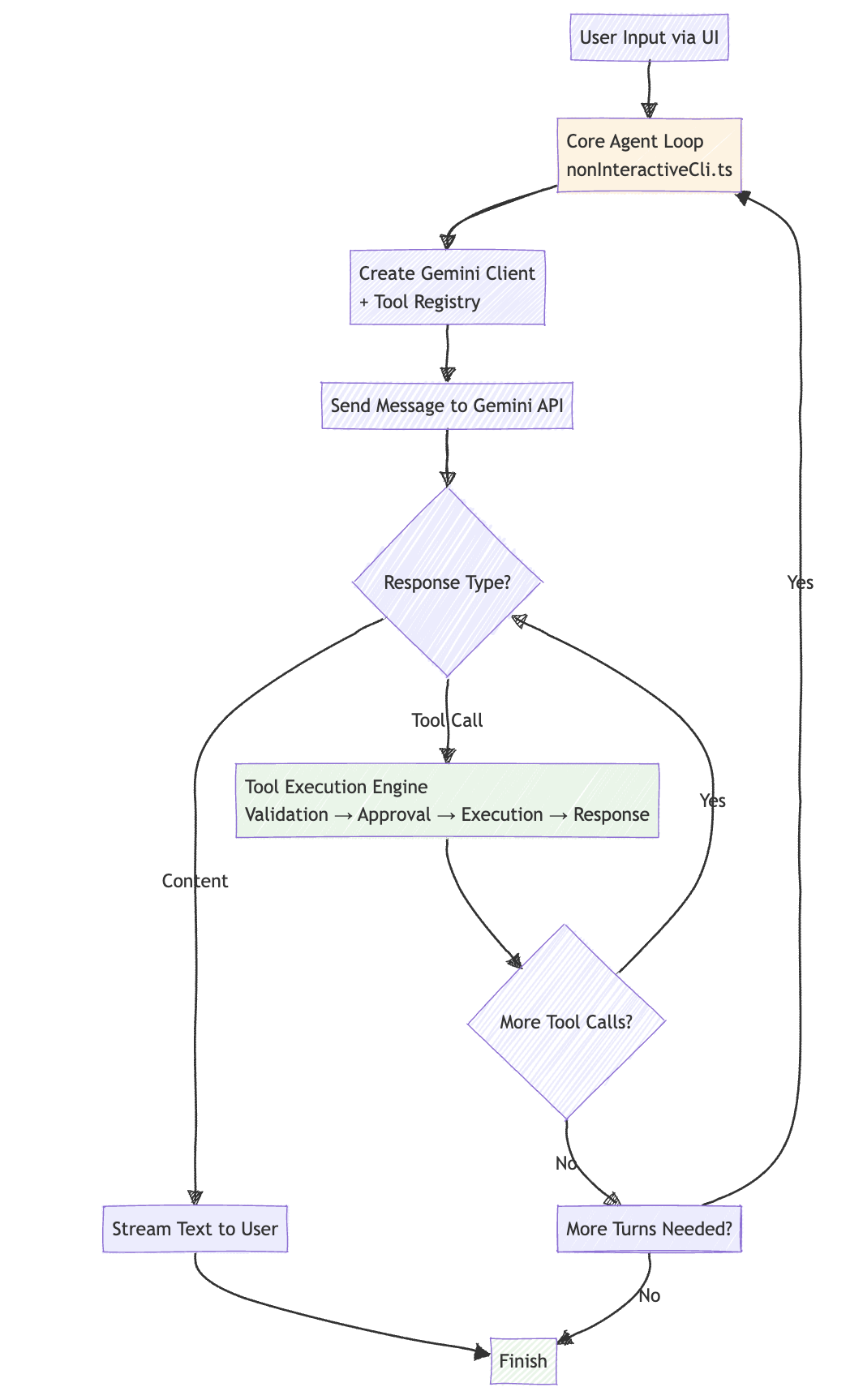 This means complex tasks like “build a piece of code” can span multiple turns (each turn: Gemini decides what tools to use → tools execute → results go back to Gemini), while simple requests end as soon as Gemini has enough information to respond without needing tools.